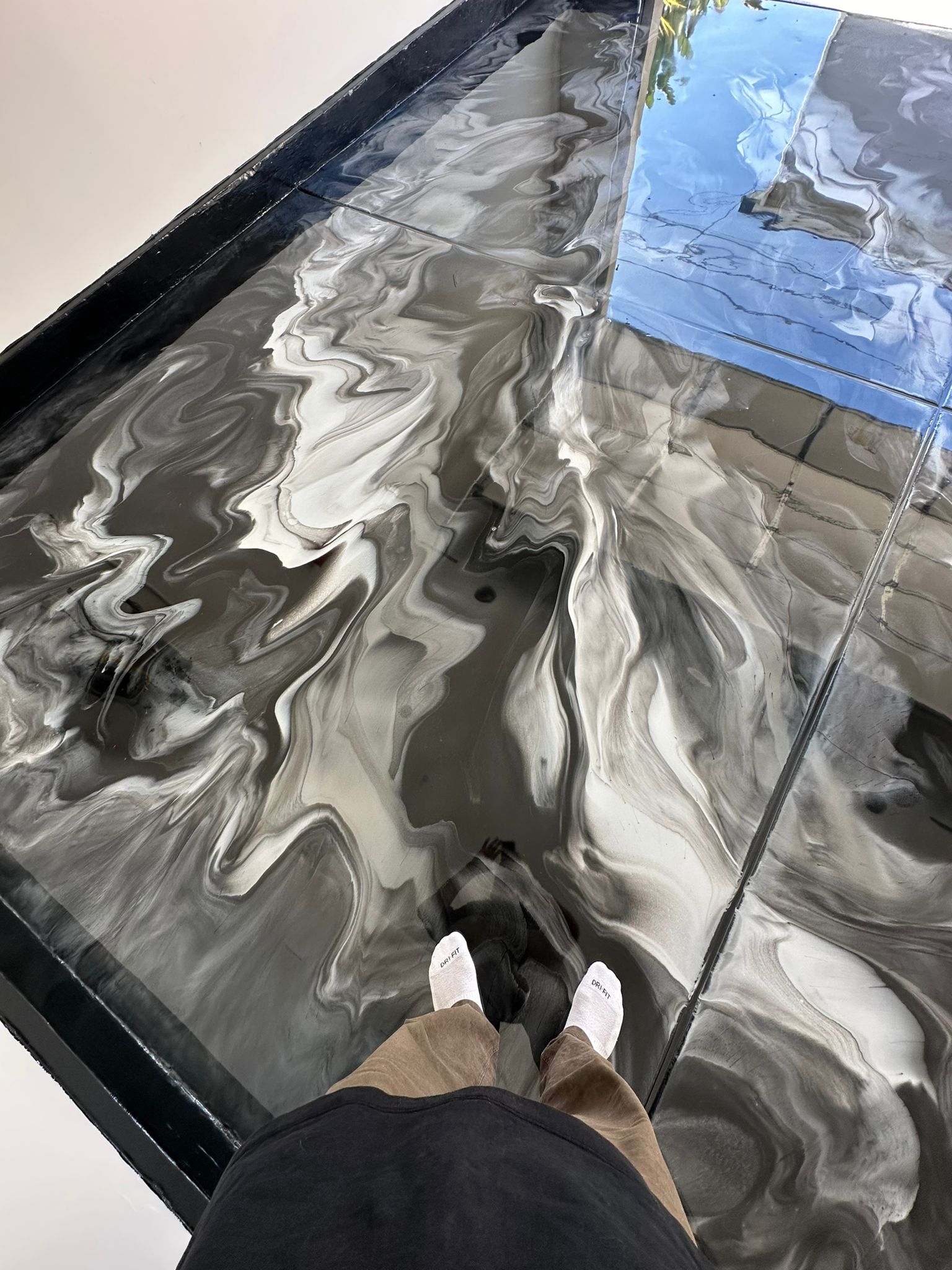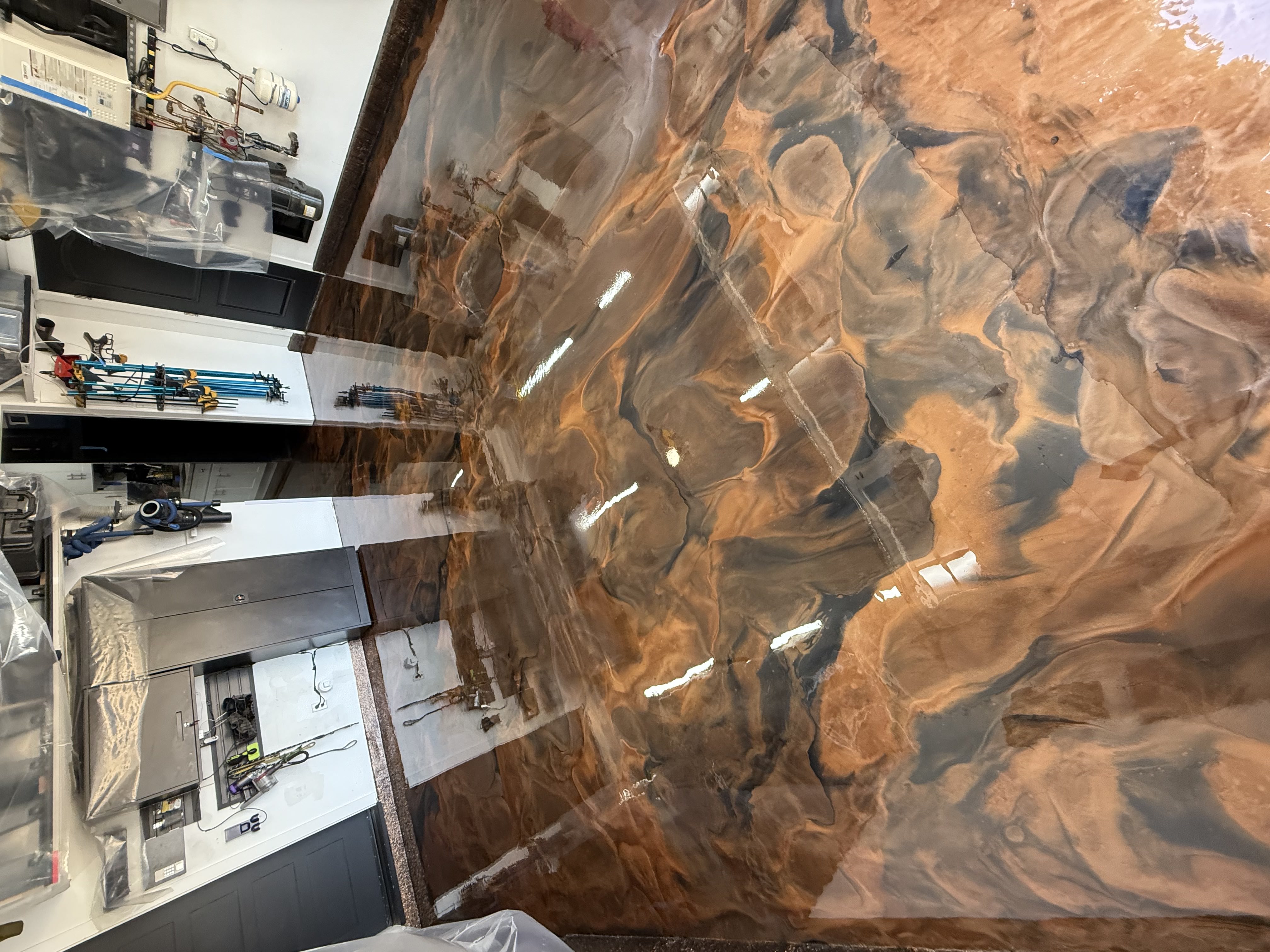 No two floors are alike. Designer epoxy creates a unique, fluid, lava-like, or pearlescent effect in every application because pigments swirl and blend unpredictably during curing.